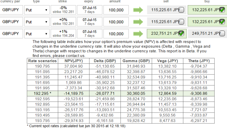 If expect the underlying currency (GBPJPY) to make the worrisome slumps, then purchase 2 lots of 7D At- The-Money puts each lot carrying delta at 0.5 and sell simultaneously an (1%) In-The-Money put with positive theta of the same maturity.