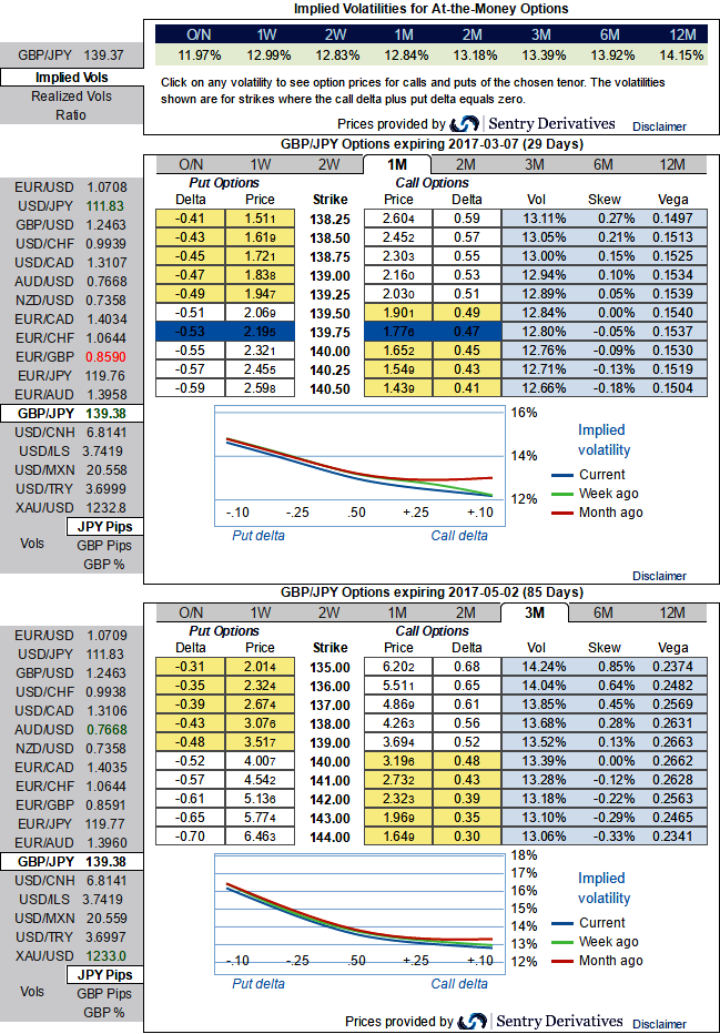 Hence, even if the aggressive volatility investors wants to capture GBP should consider buying ATM put instruments and/or being long of the smile convexity, against ATM volatility. But further GBPJPY weakness and/or abrupt upswings suggests building a directional and volatility patterns at the same time: the value of OTM puts would unlikely to rise significantly as the IVs do not seem to be favoring these distant strikes. We, therefore, recommend buying a 3m IV skews and risk reversal with ATM options.