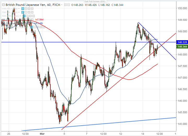 - GBP/JPY has shown a decline of almost more than 150 pips yesterday on account of strong yen. The yen was trading higher against all majors as safe haven demand increased on account of US trade war. The pair hits intraday low of 148.84 and shown a minor jump from that level. The pair is currently trading around 148.35.