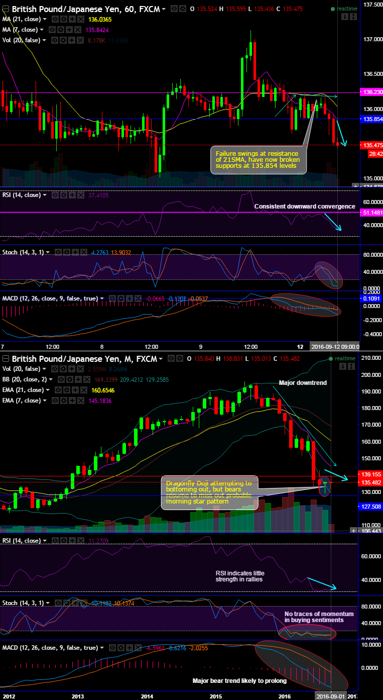 Failure swings at the resistance of 136.230 (21SMA), have now broken supports at 135.854 levels.