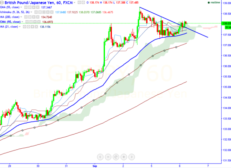 - GBP/JPY breaks minor trend line resistance around 137.95 and jumped till 138.17 at the time of writing.