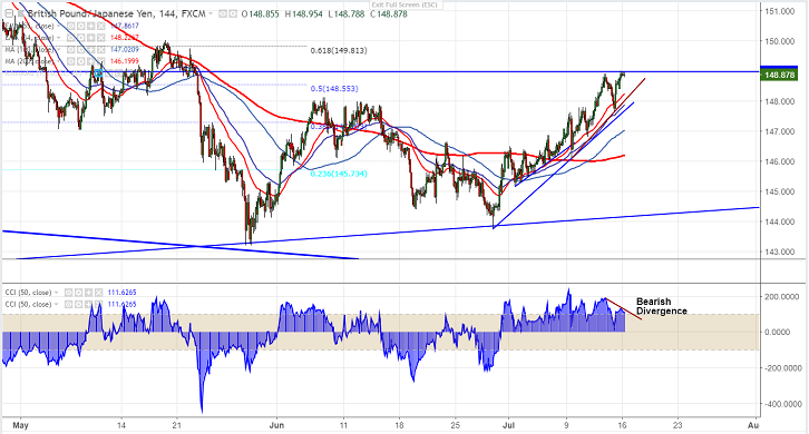 - GBP/JPY has recovered more than 100 pips from Friday’s low at 147.64 on account of slight rebound in GBPUSD. Cable has shown a huge decline on Friday after Donald Trump mentioned in the Sun interview that UK PM Theresa May soft Brexit plan will kill the bilateral trade between US and UK. But in the press conference with UK PM May he said US will welcome trade talks with UK post -Brexit and pound sterling recovered more than 150pips. The yen was trading weak especially against US dollar.USDJPY jumped more than 250 pips in previous week and hits high of 112.80. It is currently trading around 112.40.GBPJPY hits intraday high of 148.99 and is currently trading around 149.06.