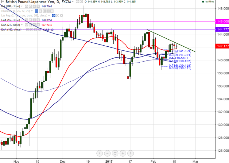 - The pair is facing strong trend line resistance at 142.60 and any break above targets 144.13 high made on Feb 1st 2017/144.78 (Jan 27th 2017 high).