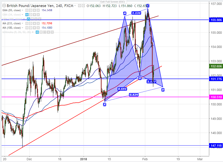 - GBP/JPY has shown a huge decline of 300 pips from the high of 156.60. The major reason for decline was increase of safe haven due to global sell-off in stock market. It has dipped till 151.20 and is currently trading around 152.65.