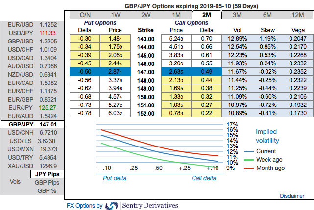 GBPJPY has rallied from the lows of 130.699 to the current 146.635 levels, which must have been factored in our previous strategy through the short leg of OTM puts. Yes, We have advocated put ratio back spreads of diagonal tenors a fortnight ago that comprised of shorts in 2w (1%) OTM put option (position seemed when the underlying spot goes either sideways or spikes mildly), simultaneously, longs in 2 lots of long in 2m ATM -0.49 vega put options.