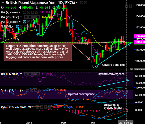 Hammer occurred at 145.831 levels and bullish engulfing pattern has occurred at 147.065 and 149.939 levels yesterday that take off rallies well above DMAs but restrained below the stiff resistance at 150.420 levels, countering these bearish swings today’s rallies have tested support at 148.887 levels, consequently, the upswings attempt to bounce above 7DMA to head towards stiff resistance at 150.420 levels yet again.