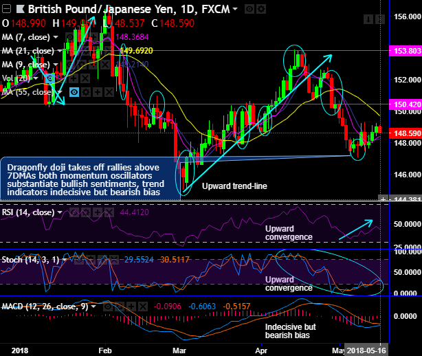 Chart and candlestick patterns occurred: Dragonfly doji has occurred at 147.821 levels to bottom out when price dips were countered by bulls last week.