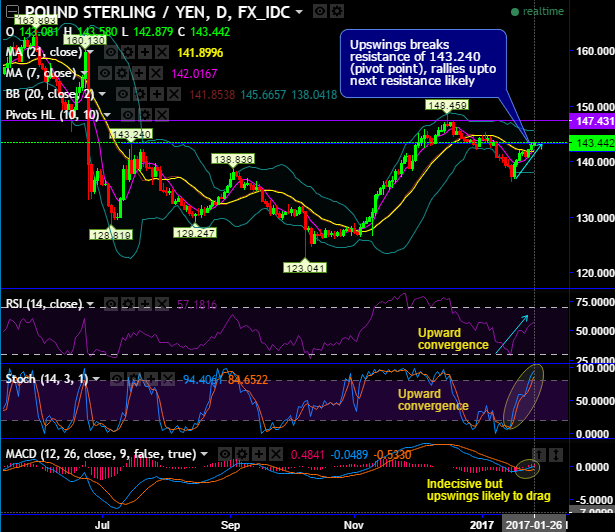 Amid this journey bulls have managed to break a resistance of 143.240 (pivot point), for now, the substance above this region indicates the extension of rallies up to next resistance (i.e. 147.431) seems to be most likely.
