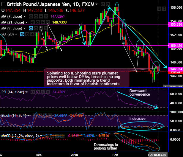 GBPJPY interim rallies attempt to spike above 7-DMAs, but that is where the spinning top pattern has occurred at 147.354 levels to restrain the rallies below DMAs (refer daily chart).