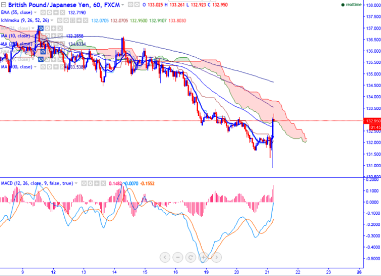 - In the hourly chart, the pair is trading well above Tenkan-Sen (131.98) and 131.98 (Kijun-Sen).