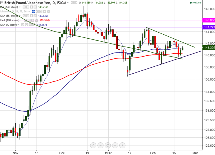 - The pair is facing strong trend line resistance at 142.25 and any close above targets 144.13 high made on Feb 1st 2017/144.78 (Jan 27th 2017 high).