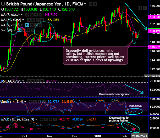GBPJPY forms dragonfly doji at 149.730 levels. The bullish pattern evidences minor rallies, but bullish momentum not convincing, current prices well below 21DMAs despite 3-days of upswings (refer daily plotting).