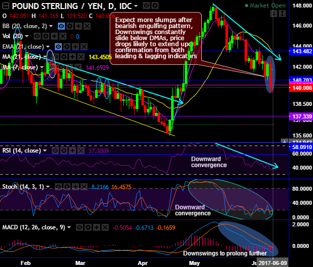 Although GBPJPY halted price drops for today at 139.520 levels, after streaks of bearish swings we’ve seen the stern bearish engulfing candle with big real body yesterday at 140.058 levels, the bulls countered today despite the bearish sentiments lingering around the corner (refer daily chart).