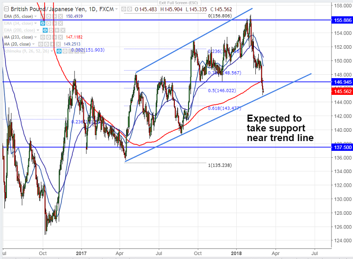 - The yen was trading strong on account increasing demand for safe haven. GBP/JPY’s near term resistance is around 147.08 (233- day MA) and any break above will take the pair to next level till 147.75 (200- day MA)/148.50. Any close above 150 confirms minor bullishness, a jump till 150.50/150.82.