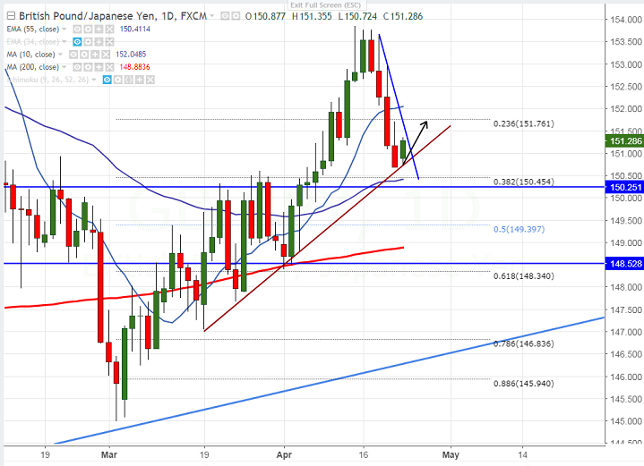 - GBP/JPY declined sharply almost 300 pips previous week on account of weak GBP. Pound sterling was trading weak against all majors in previous week on account of weak UK economic data.UK CPI , wage growth and retail sales data came below estimate. BOE Mark Carney told in interview that chance of rate hike in the month of May will be less.