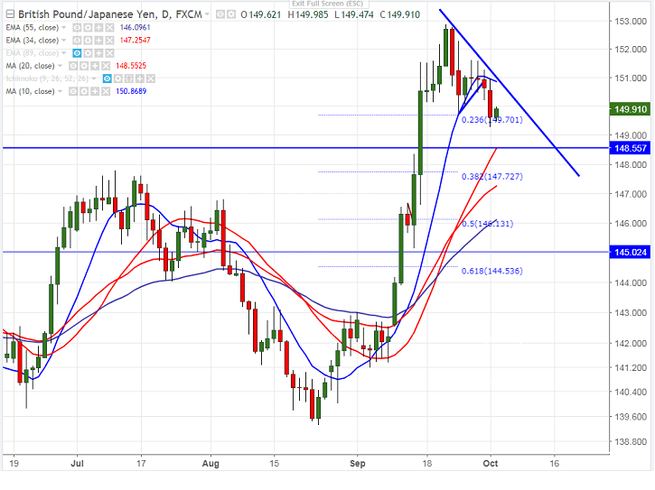 - On the lower side, near term support is around 149 and any break below will drag the pair down till 148.14 (20- day MA)/147.09 (34- day EMA)/146.45 (daily Kijun-Sen).