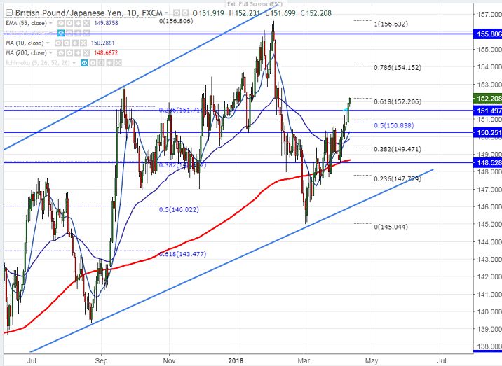 - GBP/JPY is continuing its bullish trend for third consecutive day. The pair made fresh high for the week at 152.16 and showing a minor profit booking. The pair recovered sharply yesterday after hawkish comments by BOE MPC member Ian McCafferty. He said that BOE should not delay hiking interest rate. GBP jumped almost more than 80 pips against USD from yesterday low of 1.31200. Market eyes UK manufacturing production, US CPI and fed minutes meeting data to be released today for further direction. It is currently trading around 152.15.