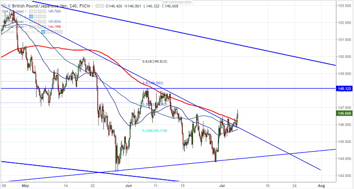 - The pair is facing strong resistance at 146.50 (Jul 2nd high) and any break above will take the pair till 147/147.29 (50% fib)/148.11. Any close above 148.11 will take the pair to next level till 149/150.