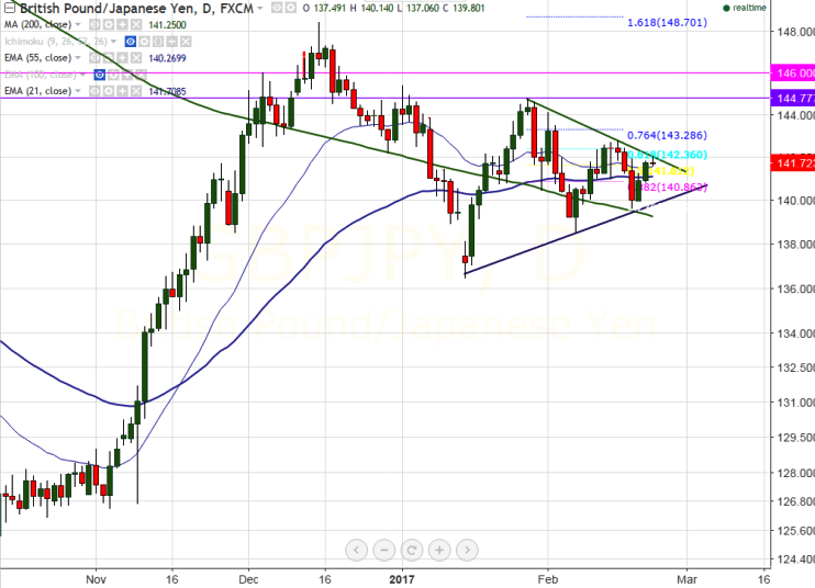 - The pair is facing strong trend line resistance at 142.05 and any close above targets 144.13 high made on Feb 1st 2017/144.78 (Jan 27th 2017 high).