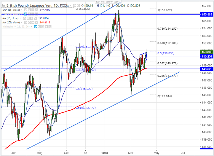 - GBP/JPY was trading higher yesterday and jumped almost more than 125 pips after weaker than expected US jobs data. US dollar was trading weak against all other major after the data. GBP rose more than 100 pips during Friday U.S session. US economy gas added only 103k jobs in the maonth of Mar compared to forecast of 193k. US average earnings has shown a minor jump upto 0.3% from 0.1%. it is currently trading around 150.78.
