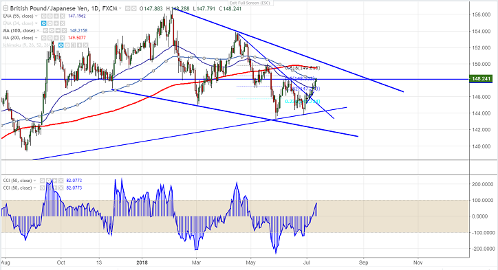 - GBP/JPY has jumped sharply more than 130 pips yesterday on account of weak yen. The yen was trading weak especially against US dollar.GBP is continuing its weakness for third consecutive days on Brexit uncertainty. The continuous back to back resignation of Brexit Secretary and Foreign Secretary has created political uncertainty. GBP movement depends on US CPI data which is to be released today. Cable is facing strong support at 1.3185 and nay violation below confirms minor weakness, a decline till 1.3100 likely.The pair hits intraday high of 148.28 and is currently trading around 148.17.