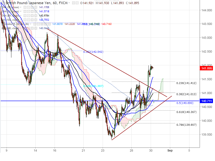 - GBPJPY broken trend line resistance at 141.25 (trend line joining 143.19 and 141.40) and jumped till 142.03 yesterday. The pair has close well above trend line resistance and is currently trading around 141.89.