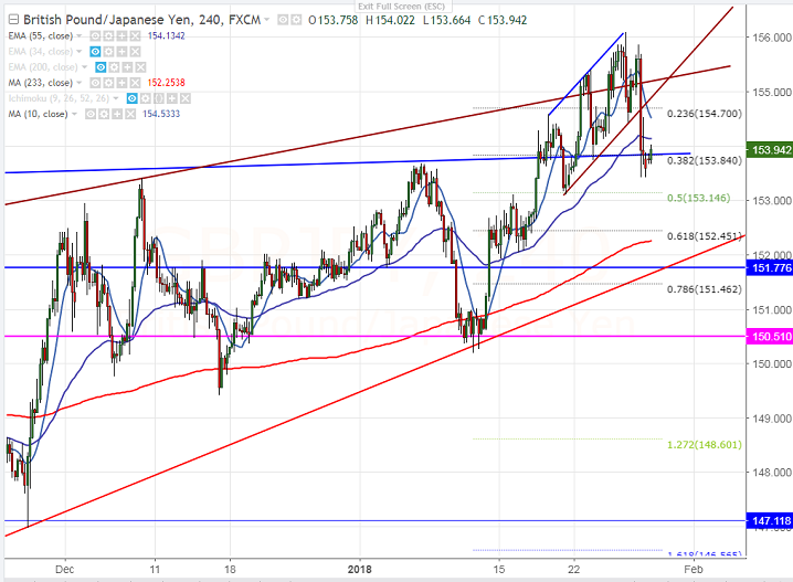 - The near term resistance is around 154.05 (23.6% fibo) and any break above will take the pair to next level till 155/155.85.