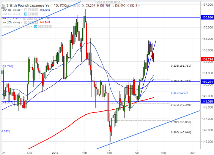- On the lower side, near term support is around 151.90 (10- day MA) and any close below will drag the pair till 151/150.59 (20- day MA).