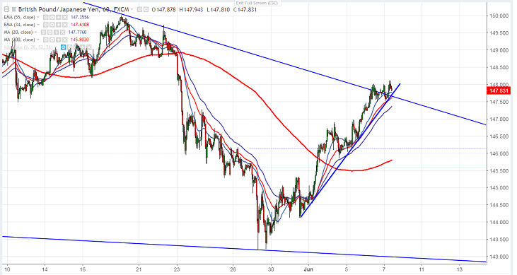 - GBP/JPY is continuing its bullishness for fifth consecutive days and jumped 500 pips from the low of 143.19 made on May 29th 2018. The yen was trading lower against all majors on account of easing political uncertainty in Italy and rising global markets. Euro and global bond yields has been trading higher on hopes that ECB might wind up stimulus program. GBP was trading higher against USD and has broken major resistance at 1.34000 and jumped till 1.34293. USD/JPY has shown a minor selling and it’s overall trend is strong. Any close above 110.17 (200 –day MA) confirms further jump and it is currently trading around 109.92 GBPJPY is currently trading around 147.85.