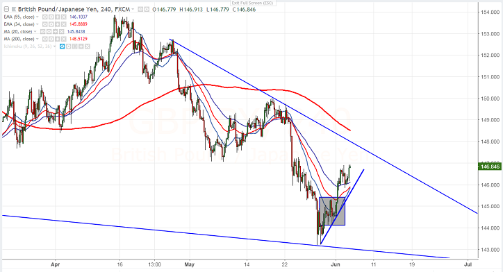 - GBP/JPY has shown a good recovery of almost more than 70 pips for the day from the low of 146.03 on account of better than expected UK services data. The pair’s jump was mainly due to easing political uncertainty in Italy as of now. GBP was trading higher and has recovered almost 75 pips after the data. UK services PMI came at 54 for the month of May compared to forecast of 52.9. USD/JPY has shown a good recovery of almost 190 pips from low of 108.12 (100- day MA) and is currently trading around 109.85. GBPJPY is currently trading around 146.65.