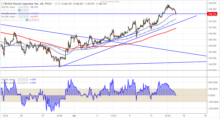 - GBP/JPY has jumped sharply till 148.89 and pared some of its gain made yesterday on account of weakness in pound. GBP was trading weak against all majors especially with USD after Brexit white paper. UK P, Theresa May has revealed her soft Brexit in full yesterday and is looking to strike free trade agreement with EU. GBPUSD has lost more than 100 pips form yesterday’s high of 1.32490. Markets eye BOE Deputy Governor Jon Cunliffe speech today for further direction. US CPI data came slightly better than expected and inflation y-o-y came at highest level in 6 years .The pair hits intraday high of 147.97 and is currently trading around 148.04.