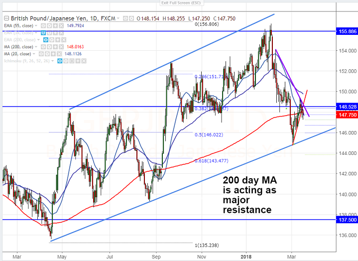 - GBP/JPY is continuing its third day of weakness after forming a temporary top around 149.37. The yen was trading higher against all majors as safe haven demand increased on account of US trade war. The pair hits intraday low of 147.25 and shown a minor jump from that level. The pair is currently trading around 147.59.