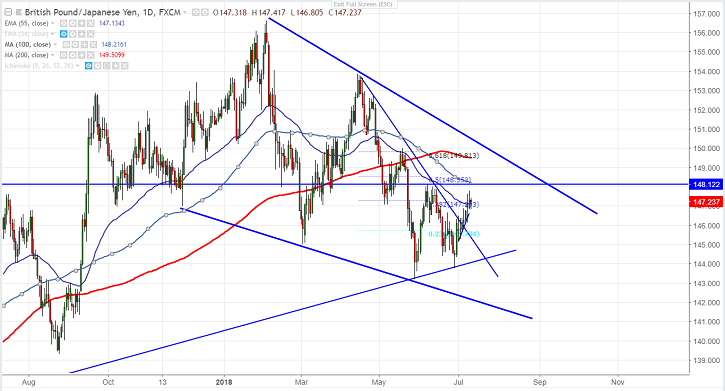 - GBP/JPY is trading highly volatile for past two trading days on account of Brexit uncertainty. The continuous back to back resignation of Brexit Secretary and Foreign Secretary has created political uncertainty. UK GDP data came at 0.3% as expected but manufacturing production came at 0.4% compared to forecast of 1.0%. The pair hits high of 147.78 and declined almost 100 pips. Cable is facing strong resistance at 34 day EMA at 1.3305 and traders using slight jump as opportunity for selling. The pair hits high of 147.41 and is currently trading around 147.22.