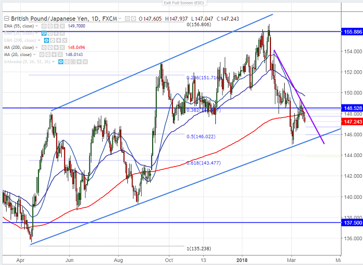 - On the lower side, near term support is around 147 and any close below will drag the pair till 146.36/145.