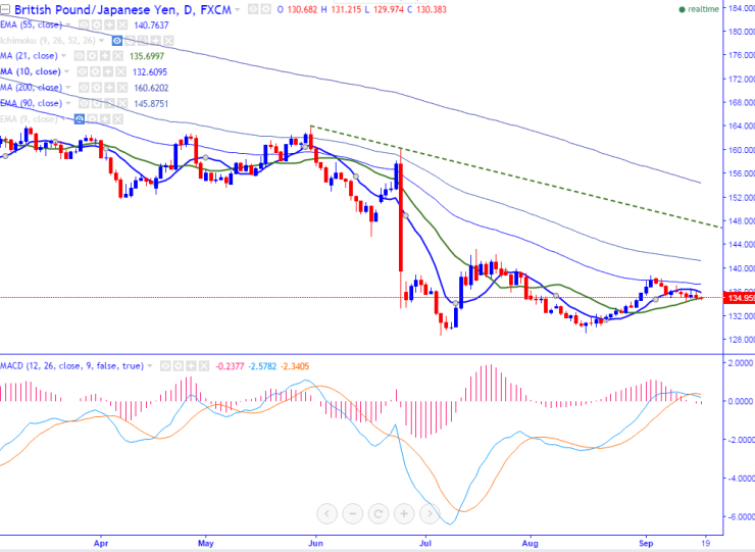 - The pair has taken support near 21- day MA and slightly recovered from that level. It is facing strong resistance at 10- day MA and struggles to close above that level. Any close above targets 137.15/138.