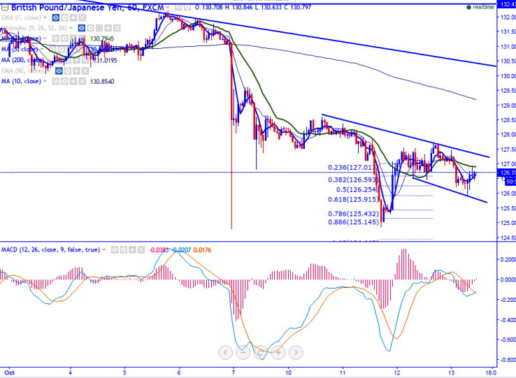- The upside is capped by 5- day MA (127.90) any slight bullishness only above that level. Any violation above that level will take the pair till 128.60 (Oct 10th 2016 high)/129.50 (61.8% retracement of 124.80 and 132.43).