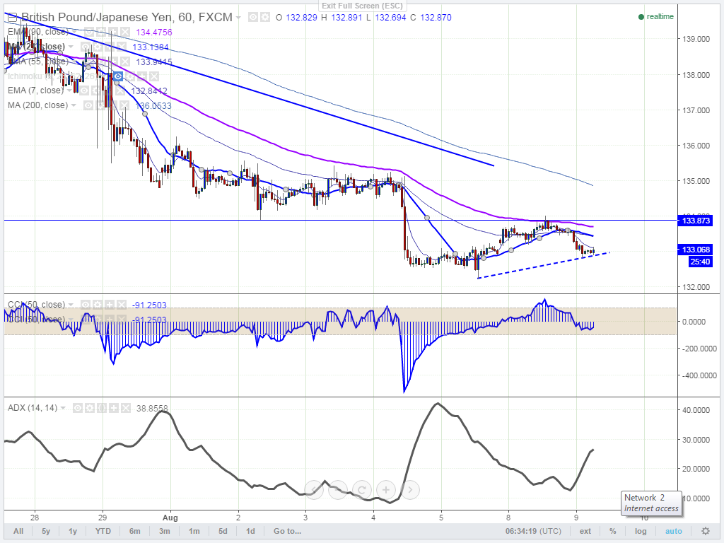 - In the hourly chart, GBP/JP Y is trading slightly well below Tenkan-Sen (133.25) and Kijun-Sen (133.45).