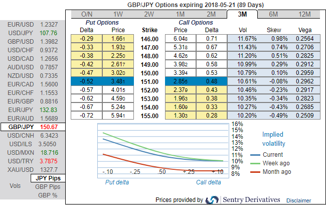 Please be noted that the positively skewed IVs of GBPJPY of 3m tenors signify the hedgers’ interests in OTM put strikes (upto 146 levels) and isn’t this a luring factor for a shrewd bear. While 1w/3m IVs of ATM contracts are trending above 11.05% and 10.69% respectively that are the suitable combinations for diagonal put ratio spreads.