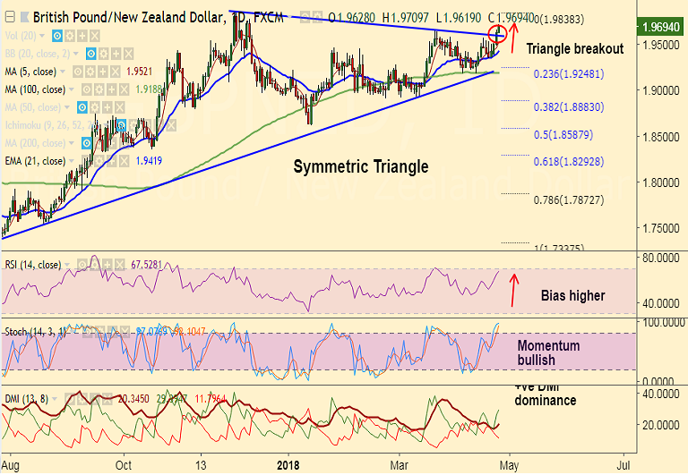 - GBP/NZD has shown a decisive breakout at 1.96 (Triangle Top), bias higher.