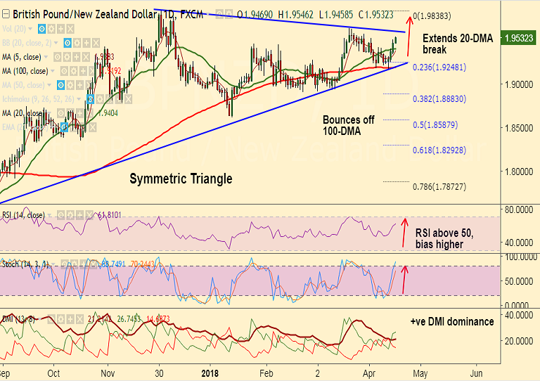 - The major is extending gains above 2-DMA and bulls now eye 'Triangle Top' at 1.96.