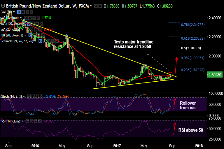 - GBP/NZD has shown triangle breakout on daily charts and is currently testing major resistance at 1.8050.