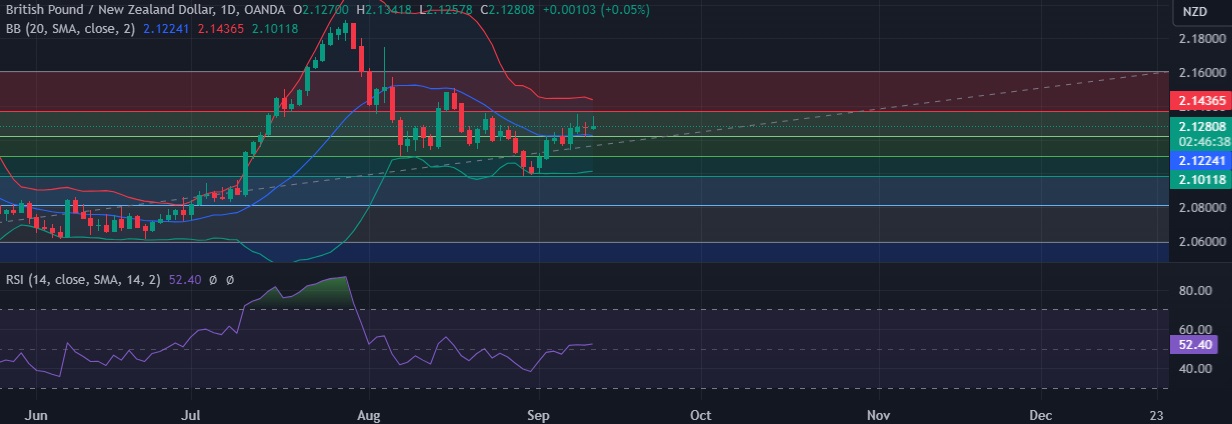 • Immediate resistance is located at 2.1364 (23.6%fib), any close above will push the pair towards 2.1428 (Higher BB).