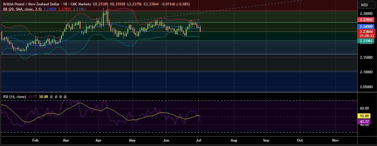 • Strong support is seen at 2.2384(50% fib) and break below could take the pair towards 2.2202(Lower BB).