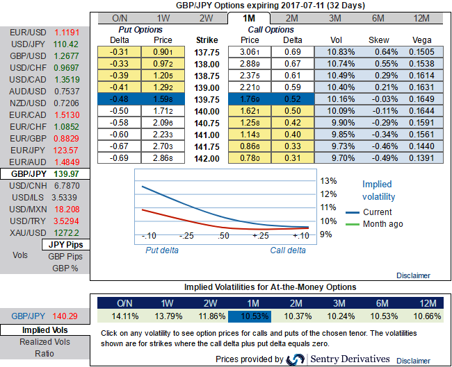 Further GBPJPY weakness and/or abrupt upswings suggest building a directional and volatility patterns at the same time: the value of OTM puts would likely to rise significantly as the IVs seem to be favoring these distant strikes. We, therefore, recommend shorting 2w IVs and buying IV skews of 2m tenors.