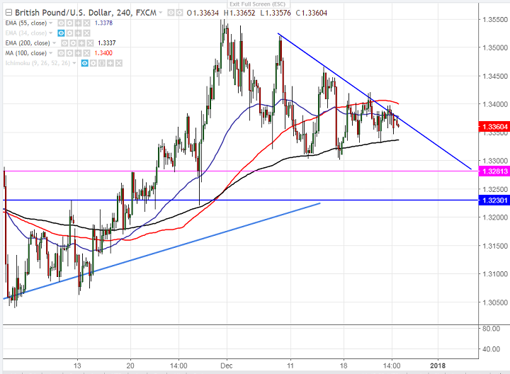 - Cable is trading very flat for the past one week on account of Christmas holidays. The UK and EU has reached first round of deal on Dec 15th 2017 and next phase on trade negotiations is expected to soon. The pair has recovered almost 100 pips from the low of 1.33029 made on Dec 15th 2017 and is currently trading around 1.3365.