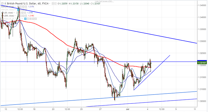 - GBP/USD recovered sharply from intraday low of 1.31705 and hits high of 1.32075. It is currently trading at 1.32038. The major UK economic data released came slightly better than expected. UK services PMI came at 55 in June, strongest expansion since Oct 2017 compared to forecast of 54. The hawkish comments by BOE MPC member Michael Saunders also supporting the price.