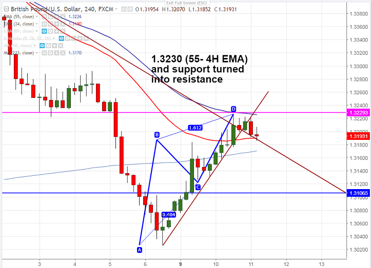 - The pair hits high of 1.32257 yesterday and has shown a minor decline from that level. Any break above 1.32300 (55- 4H EMA and support turned into resistance) confirms minor bullishness, a jump till 1.3300/1.3350 likely.