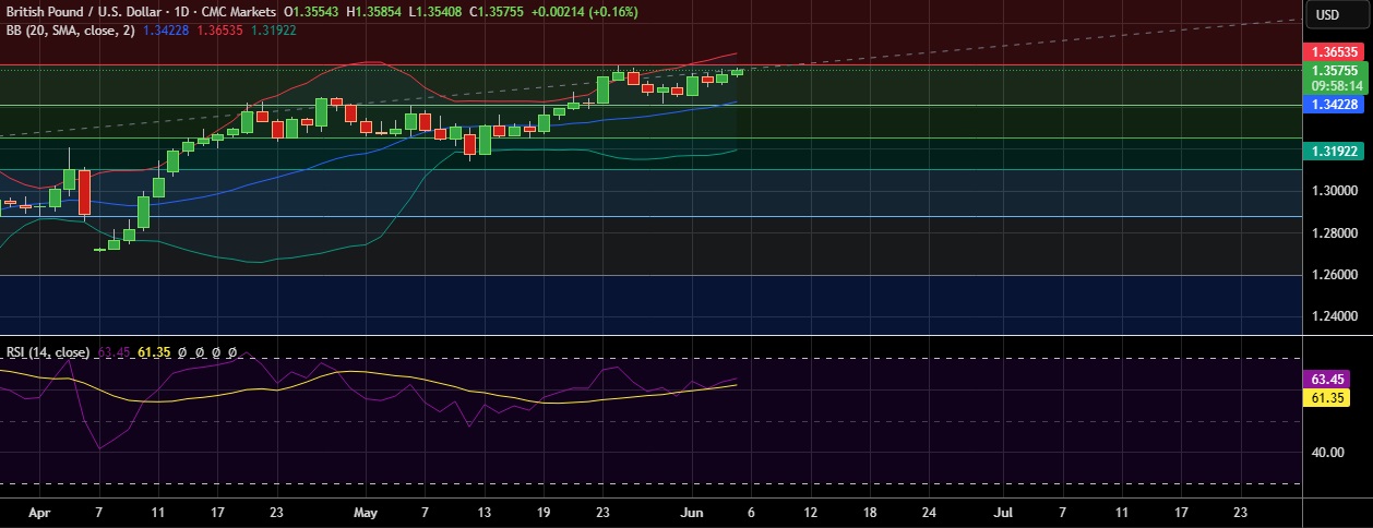 • Immediate resistance is located at 1.3601(23.6%fib), any close above will push the pair towards 1.3653( Higher BB)