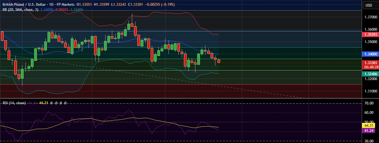 • Strong support is seen at 1.3268 (38.2%fib) and break below could take the pair towards 1.3241(Lower BB).