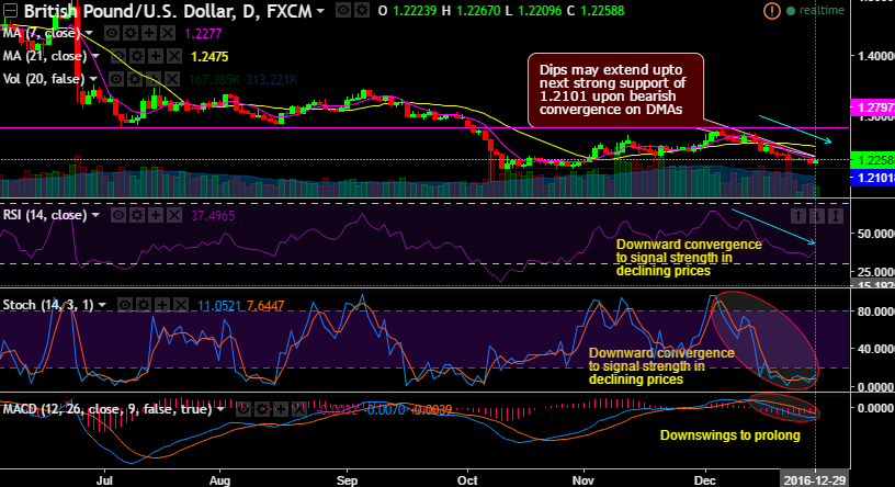 On daily charts, price dips may extend up to next strong support of 1.2101 upon bearish convergence on DMAs (7DMA crosses below 21DMA which is a bearish convergence).